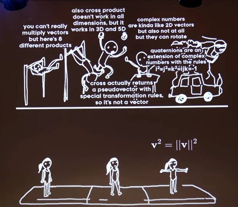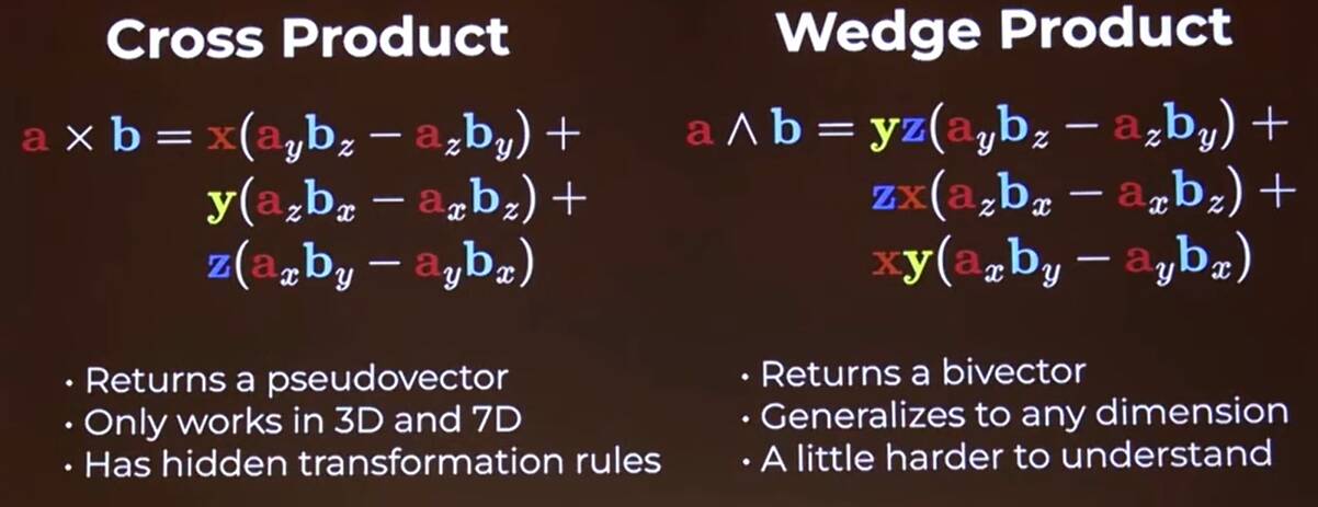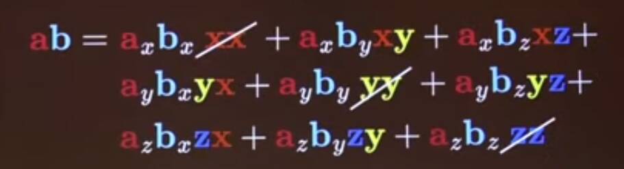 Writing \(\mathbf{a}=a_x\mathbf{x} + a_y\mathbf{y} + a_z\mathbf{z}\), and naively expanding: \[ \begin{align*} \mathbf{ab} &= a_xb_x\mathbf{x}\mathbf{x} + a_xb_y\mathbf{x}\mathbf{y} + a_xb_z\mathbf{x}\mathbf{z} \\ &+ a_yb_x\mathbf{y}\mathbf{x} + a_yb_y\mathbf{y}\mathbf{y} + a_yb_z\mathbf{y}\mathbf{z} \\ &+ a_zb_x\mathbf{z}\mathbf{x} + a_zb_y\mathbf{z}\mathbf{y} + a_zb_z\mathbf{z}\mathbf{z} \end{align*} \] and then \(\mathbf{x}\mathbf{x} = 1\), so this simplifies to \[ \begin{align*} \mathbf{ab} &= a_xb_x + a_xb_y\mathbf{x}\mathbf{y} + a_xb_z\mathbf{x}\mathbf{z} \\ &+ a_yb_x\mathbf{y}\mathbf{x} + a_yb_y + a_yb_z\mathbf{y}\mathbf{z} \\ &+ a_zb_x\mathbf{z}\mathbf{x} + a_zb_y\mathbf{z}\mathbf{y} + a_zb_z \end{align*} \] So collecting the scalars \[ \begin{align*} \mathbf{ab} &= a_xb_x + a_yb_y + a_zb_z &+ a_xb_y\mathbf{x}\mathbf{y} + a_xb_z\mathbf{x}\mathbf{z} \\ &+ a_yb_x\mathbf{y}\mathbf{x} + a_yb_z\mathbf{y}\mathbf{z} \\ &+ a_zb_x\mathbf{z}\mathbf{x} + a_zb_y\mathbf{z}\mathbf{y} \end{align*} \] So what are \(\mathbf{x}\mathbf{z}\) etc.? Consider the diagonal between \(\mathbf{x}\) and \(\mathbf{y}\):